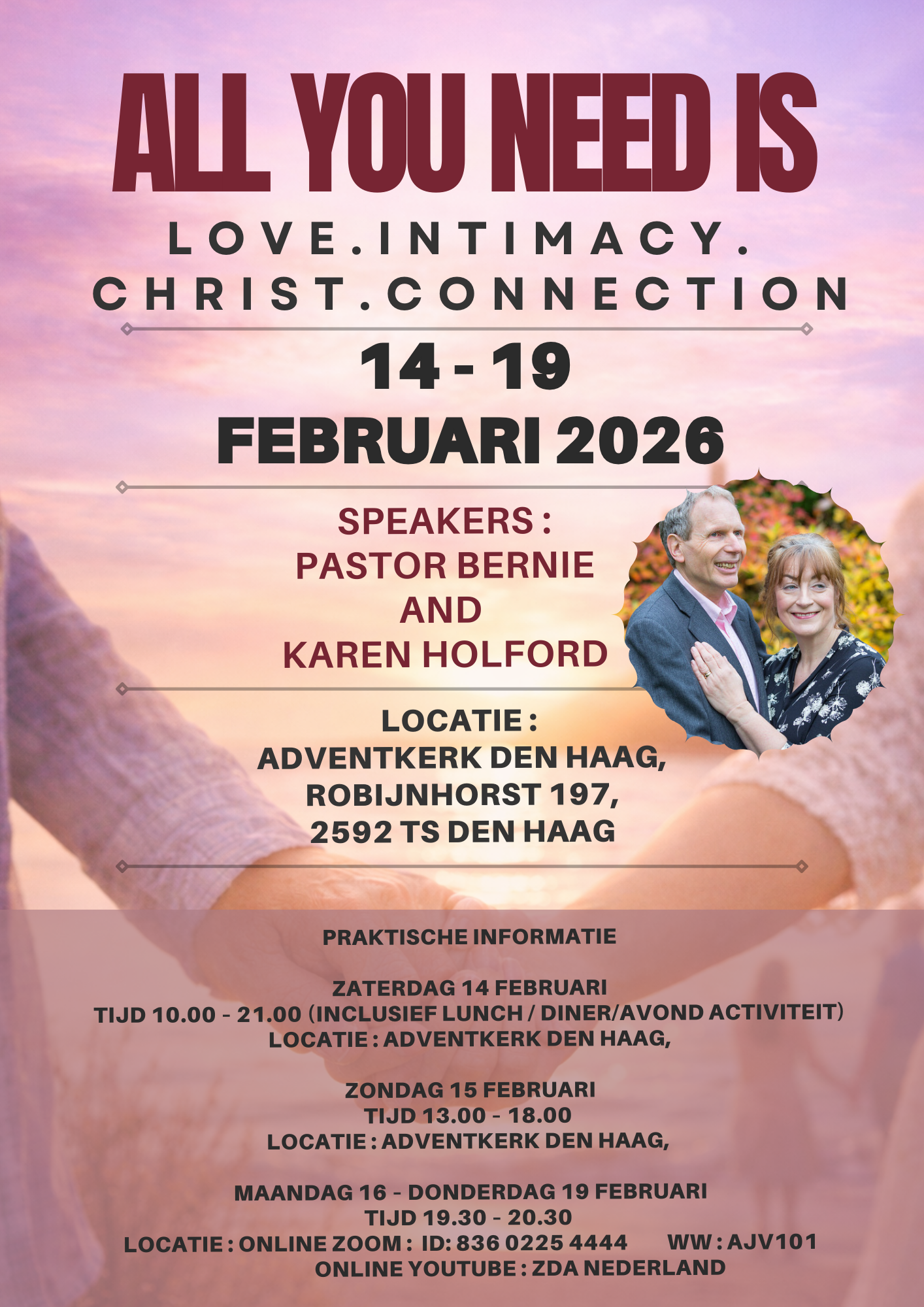 Van 14 tot en met 19 februari 2026 staat de Adventkerk in Nederland volledig in het teken van relaties en gezinsleven. Onder het creatieve thema “All You Need is …” wordt een veelzijdig programma aangeboden dat koppels en gezinnen helpt om opnieuw te investeren in liefde, intimiteit, geloof en verbinding.