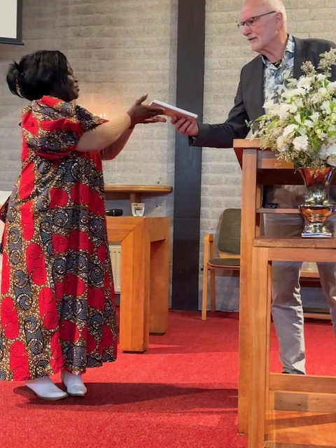 Veertien dagen later werd Françoise Sabuni Chikunda (54) als lid opgenomen in de Adventkerk Leeuwarden. Afkomstig uit Congo heeft zij zeer moeilijke jaren in diverse vluchtelingenkampen moeten doorstaan. Jaren van geweld en oorlog liggen achter haar. Zelf heeft ze de sabbat vanuit de Bijbel leren kennen, en ze is een blijmoedig christen. Ze is een aantal jaren geleden in een vluchtelingenkamp in Uganda gedoopt. Sabuni (woonachtig in Hallum) ontving uit handen van ouderling Herman het boekje ‘Buig niet’ van Ad van Nieuwpoort. Een boeket bloemen was al eerder gegeven. Na opname sprak ze haar blijdschap en dankbaarheid uit naar de gemeente.